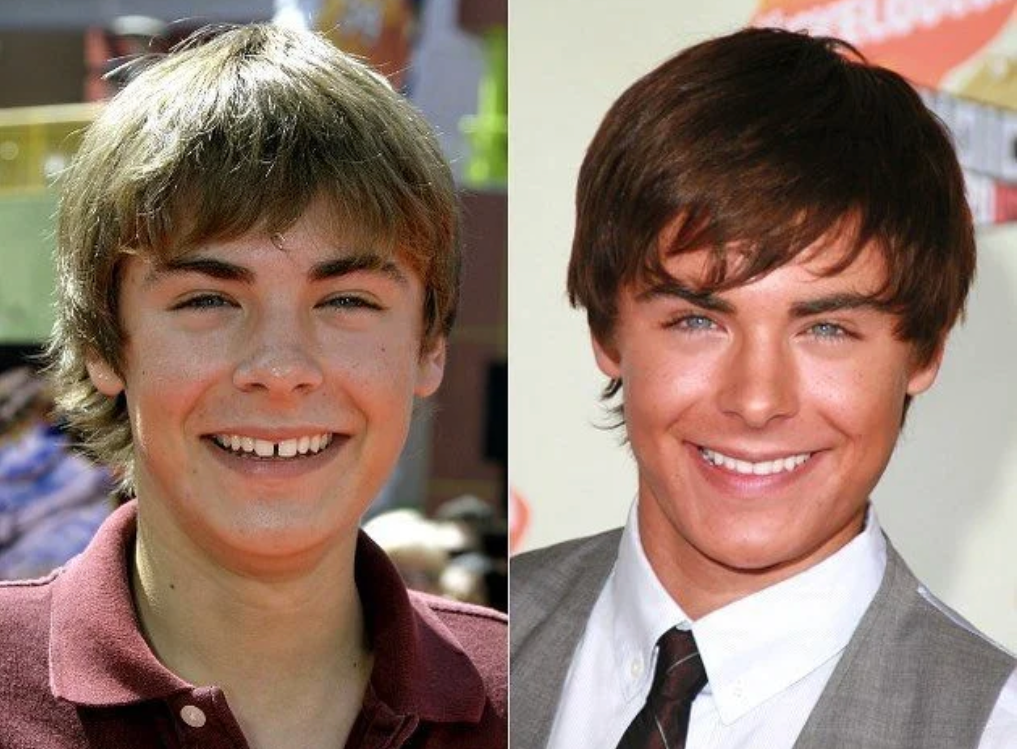 (A clear before-and-after comparison of Zac Efron’s smile, highlighting his dental transformation)